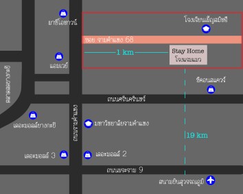 Our Hotel located on Ramkamhaeng soi 68. Far from Suvarnabhumi Airport 19Km. is a 30 minute drive. You can open our Map or any question, Please feel free to call us 088 – 282 -3773